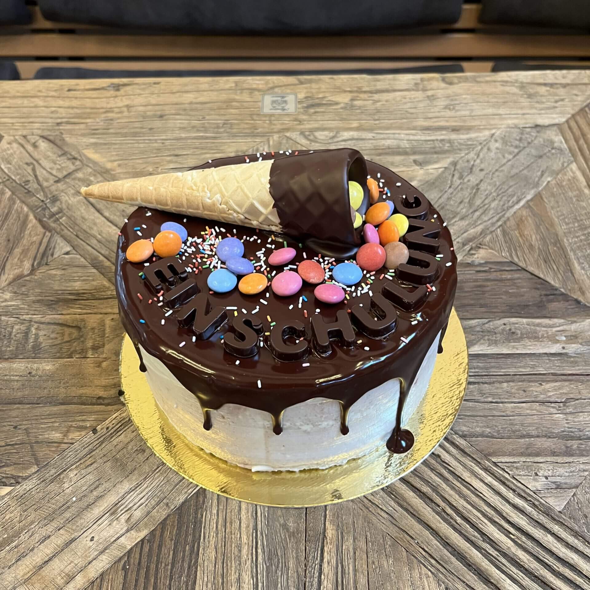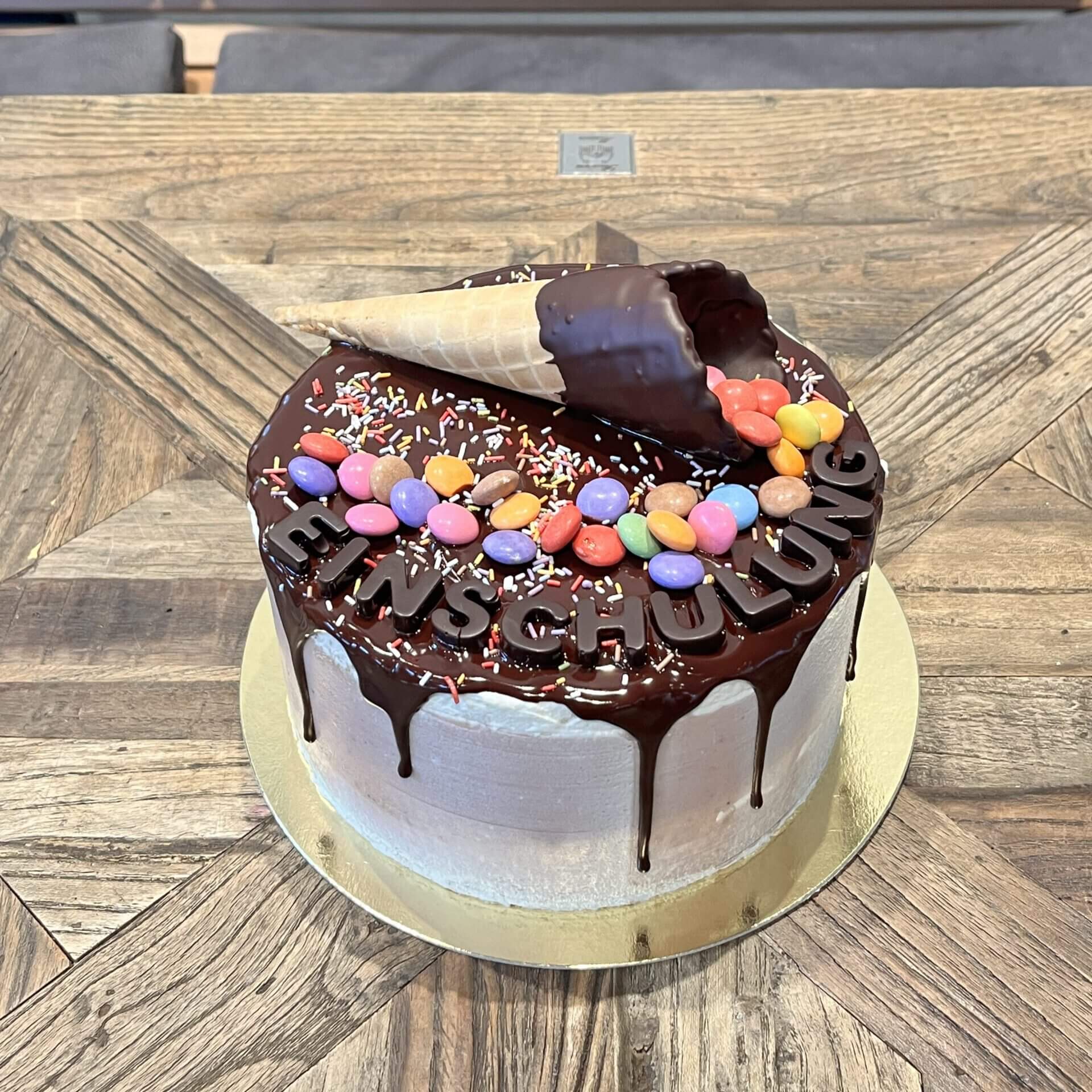 Wählt einfach in den Varianten die richtige Größe und Eure Lieblingsgeschmacksrichtung aus. Die Torte wird mit einem Schokodrip, einer Eiswaffel, bunter Deko und einem Caketopper dekoriert. Details zum Caketopper könnt Ihr im entsprechenden Feld angeben.