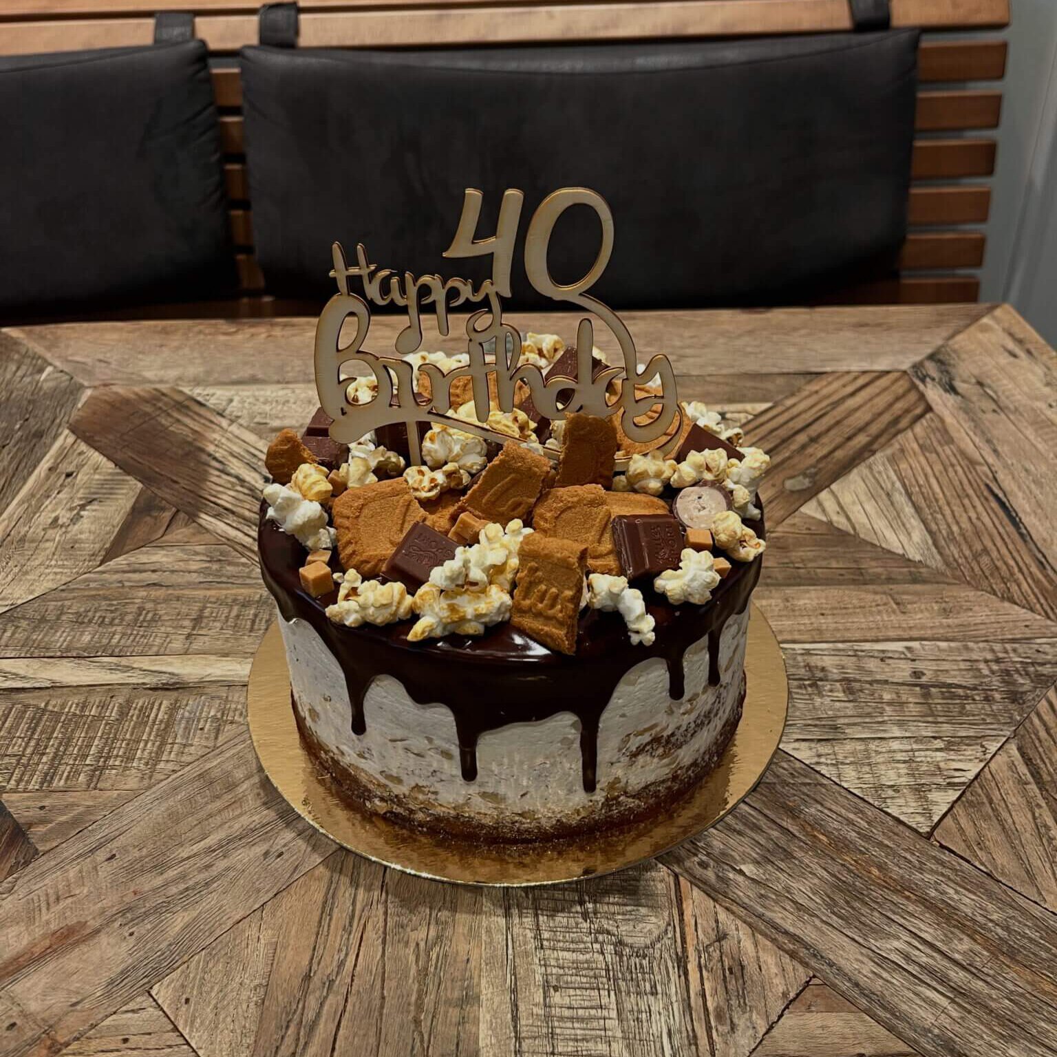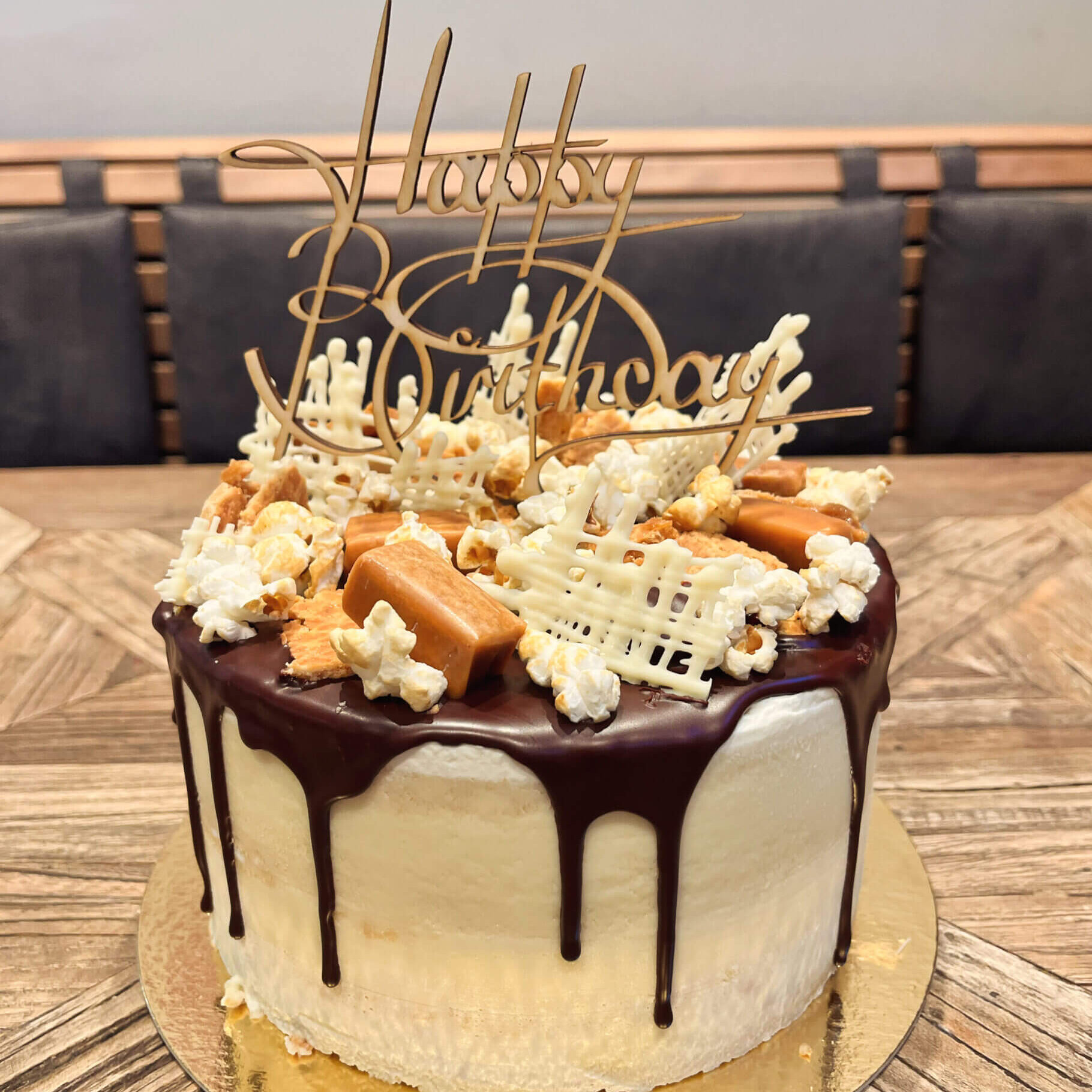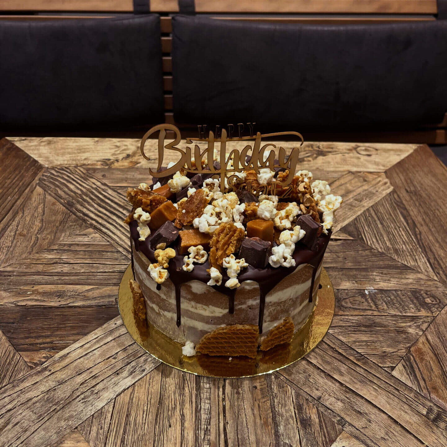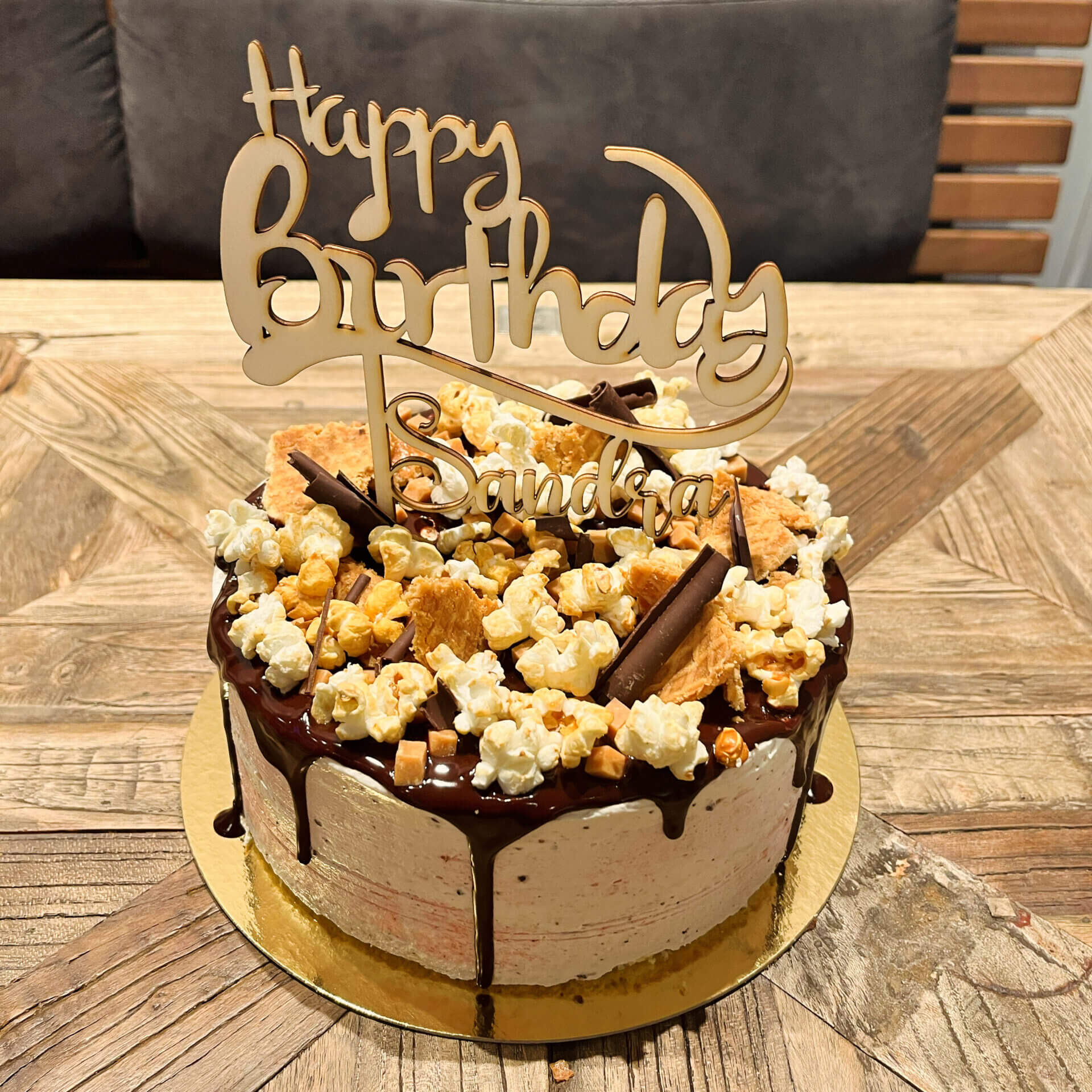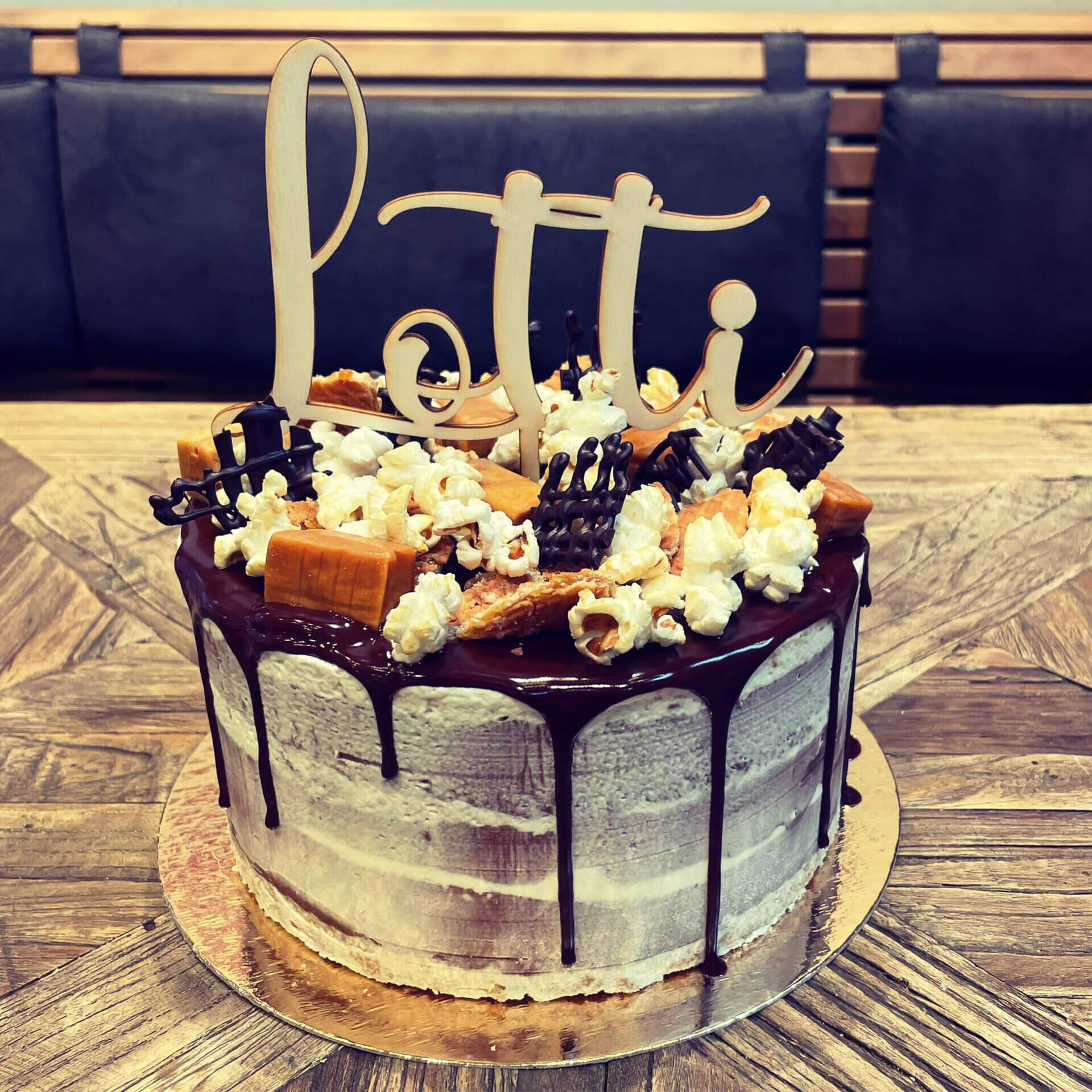 Wählt einfach in den Varianten die richtige Größe und Eure Lieblingsgeschmacksrichtung aus. Die Torte wird mit einem Schokodrip und verschiedenen Leckereien (Beispiele auf dem Foto) dekoriert.