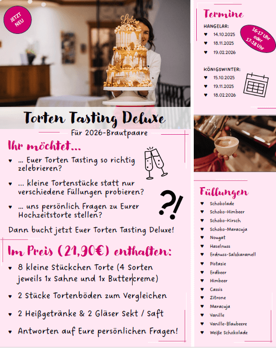 Persönliche Beratungsgespräche gibt es bei uns zwar nicht, aber so stellen wir sicher, dass wir uns genug Zeit für Euch und Eure Traumtorte nehmen können! Alternativ gibt es für 2026-Brautpaare ganz neu unser Deluxe-Tasting, das Ihr per Mail anfragen könnt (Details siehe Bild).